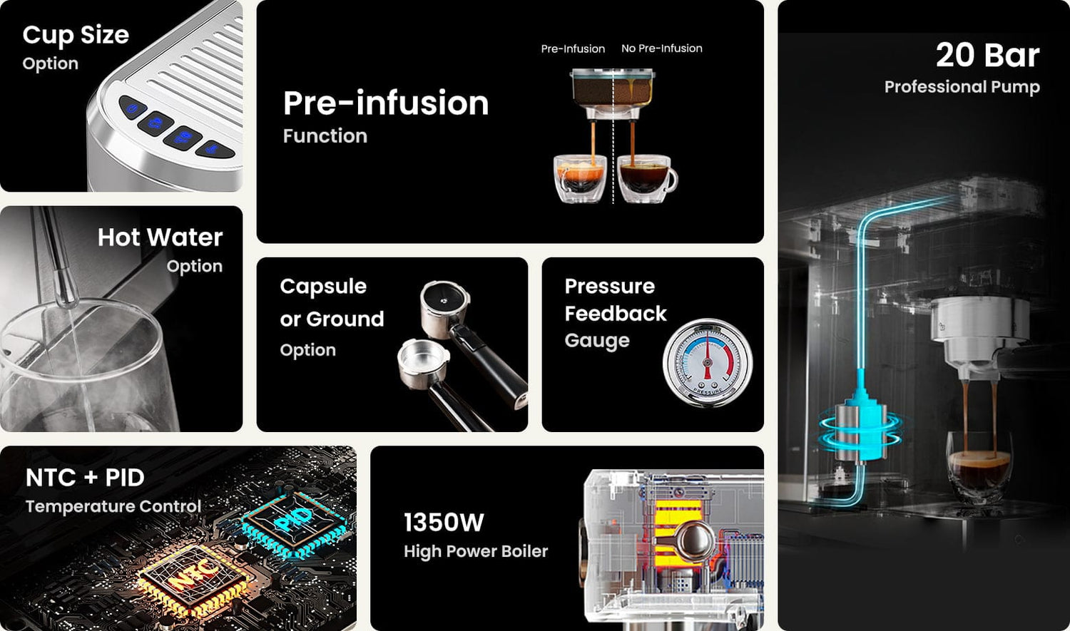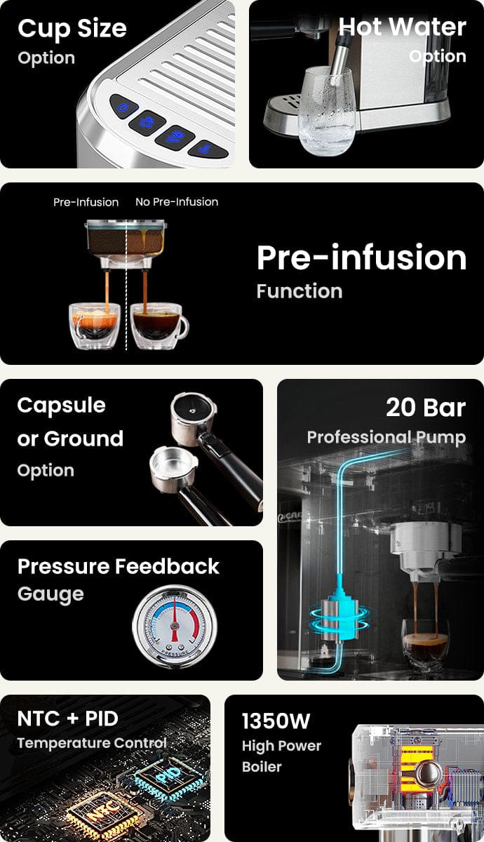 Delivers stable high-pressure water flow, ensuring rich, balanced extraction.